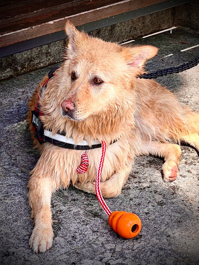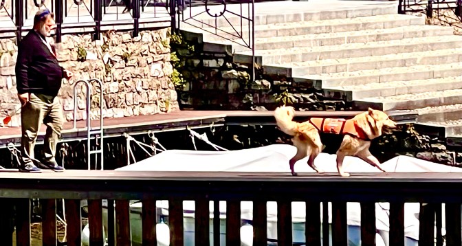We settled into a table at a cafe and as we watched the people strolling along the docks and tree-lined street, a man and his dog arrived at the pier. The dog (a lab mix) was wearing a lifejacket vest, and the man carried a ball on a rope. They walked out to the end of the pier, ( approx 8-10 ft above the water level). The man gently swung the roped ball back and forth as the dog sat so very still in anticipation. Finally the man released the ball which sailed off into the water. Still the dog sat, waiting for the okay to go. With a signal, the dog lept of the dock into the water far below. He paddled out and got the ball. You’ve seen this before you think, but there is no shore to reach. We wondered how the dog would get out of the water.