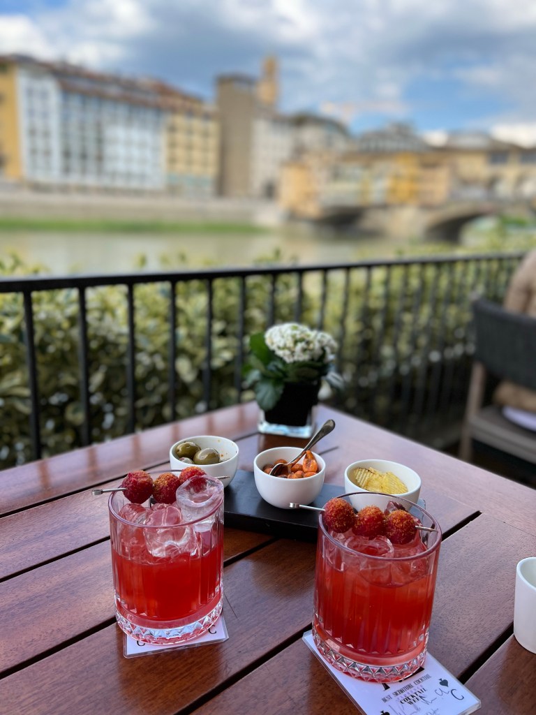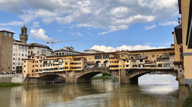 With a smaller crowd, the chance to window shop the many stores selling Italian pottery, jewelry, t-shirts, leather bags, etc, or the cafes serving a Spritz or espresso is movie- like. In the past we have squeezed into the alcove of the Hotel Lungarno whose outdoor bar glimpses the Arno River offering a picturesque vantage point to view the bridge and snap a photo.
