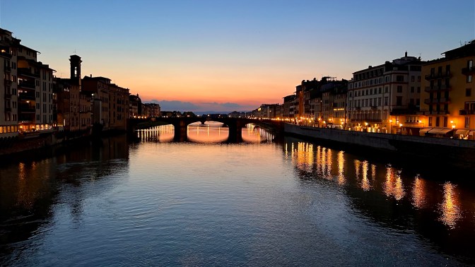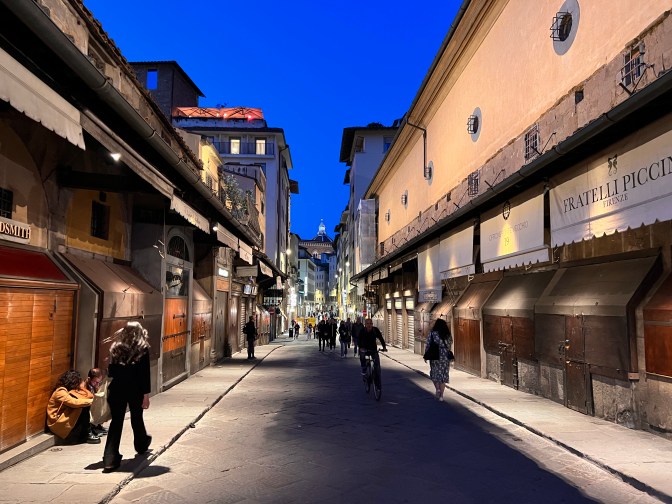 Today, we stroll comfortably through a calm relaxed piazza. There are certainly people, but the crush has not yet returned. The beauty of Florence shines . The walk to the Ponte Vecchio is energizing.