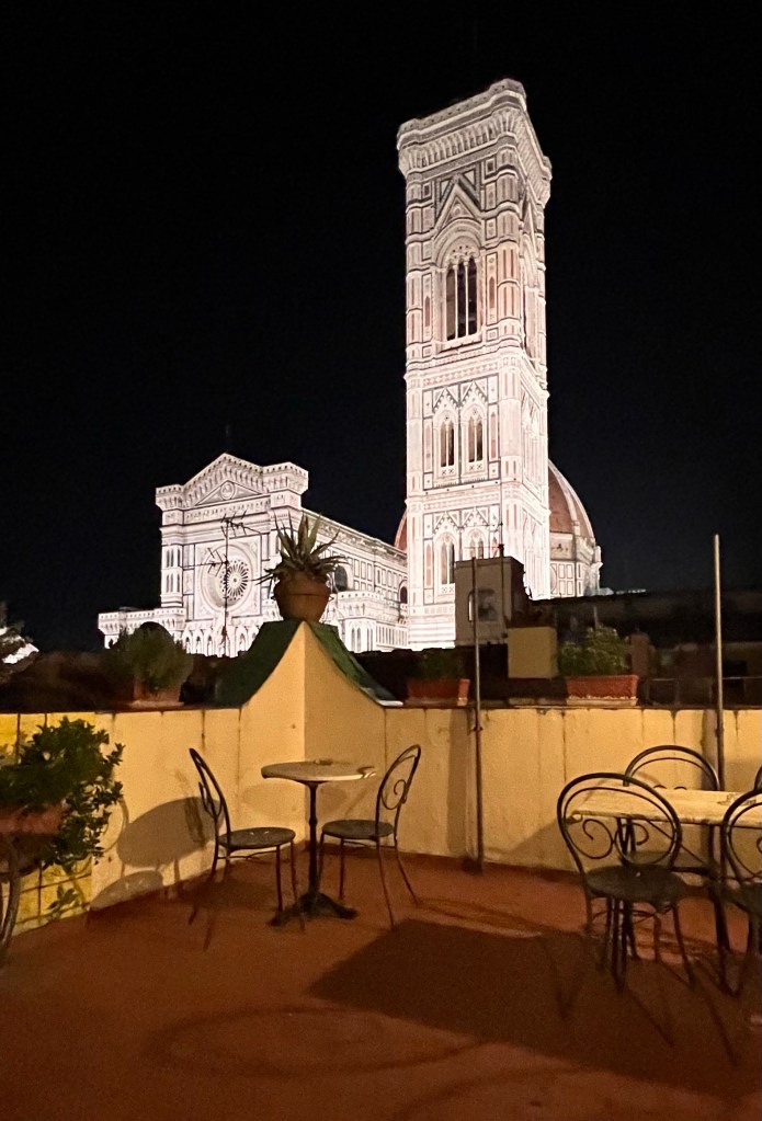We are staying in a hotel (Residenza Giotto) right across from the bell tower. We love it there. The balcony is tucked away from the street, but opens to a grand view of the Duomo and to a wonderful ( and nearly deafening) sound of the bells.