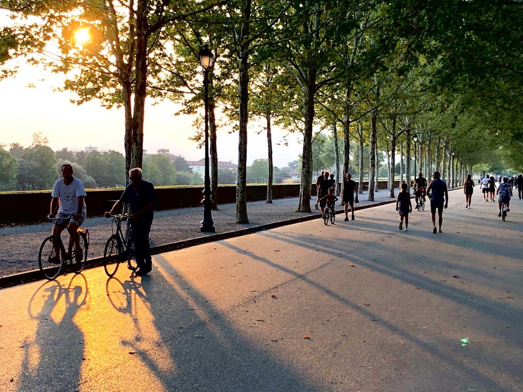 Social exchange, the views from above on the wall into the playgrounds and schoolyards, the friends meeting along the path, or the visitors and families trying out the bikes and the cafe and the grassy areas to run and play are inviting and inspiring. The nightly passagiata with a community of strangers and friends coming together brings a peace and a connection that is sorely needed today. 2022- there is still a vibrancy in Lucca.