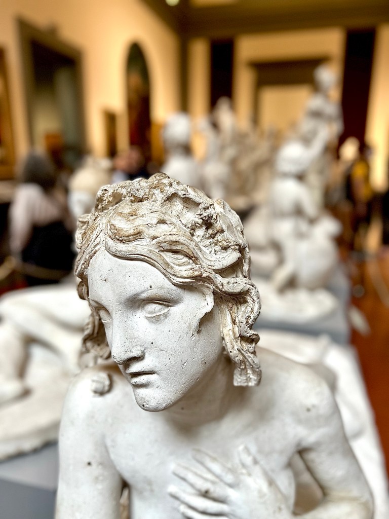 At the end of the hallway in a rotunda with swarms of fans the majestic David stands looking off to set his sight on Goliath. David is impressive on steroids! As a human specimen, he is remarkable in detail and complexity. His veins seem to course blood. His muscles flexed or at rest are powerful and his skin is smooth softly inviting. This is a stark contrast to the prisoners who still carry so much rough hune rock around with them.