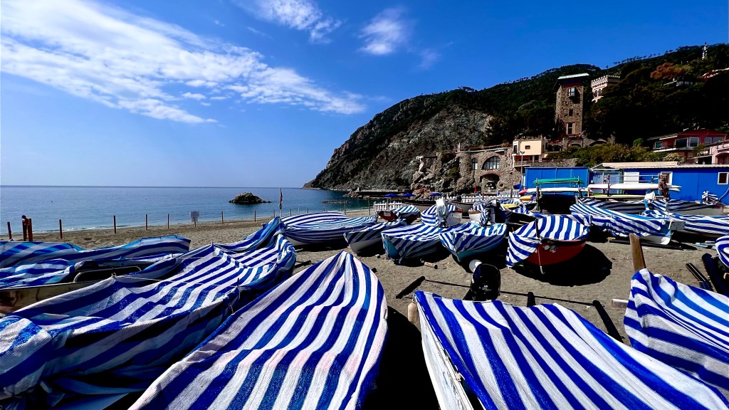 We stroll the boardwalk area admiring the colorful beach umbrellas and boat covers striped in white and blue. Cafes and gelaterias are waking up with the arrival of the latest train.