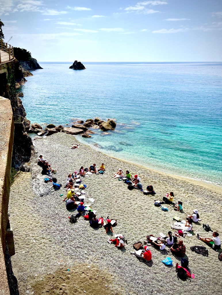 Italian children /students enjoying an outdoor classroom lesson at the beach. We have seen many outdoor educational experiences on this trip…? Interesting