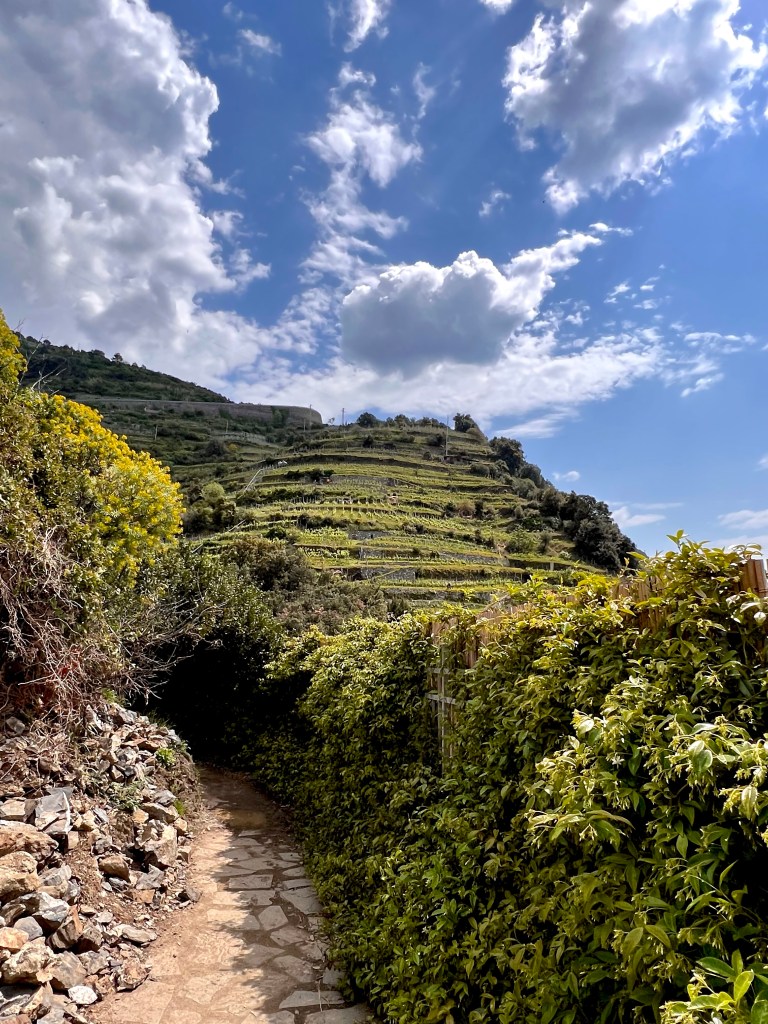 We head out to the roadway that leads up to the trailhead. The hike from Monterossa to Vernazza is steep climb up rocky steps and craggy ledges. Just when you think it will level out, you turn and find another vertical climb awaits.