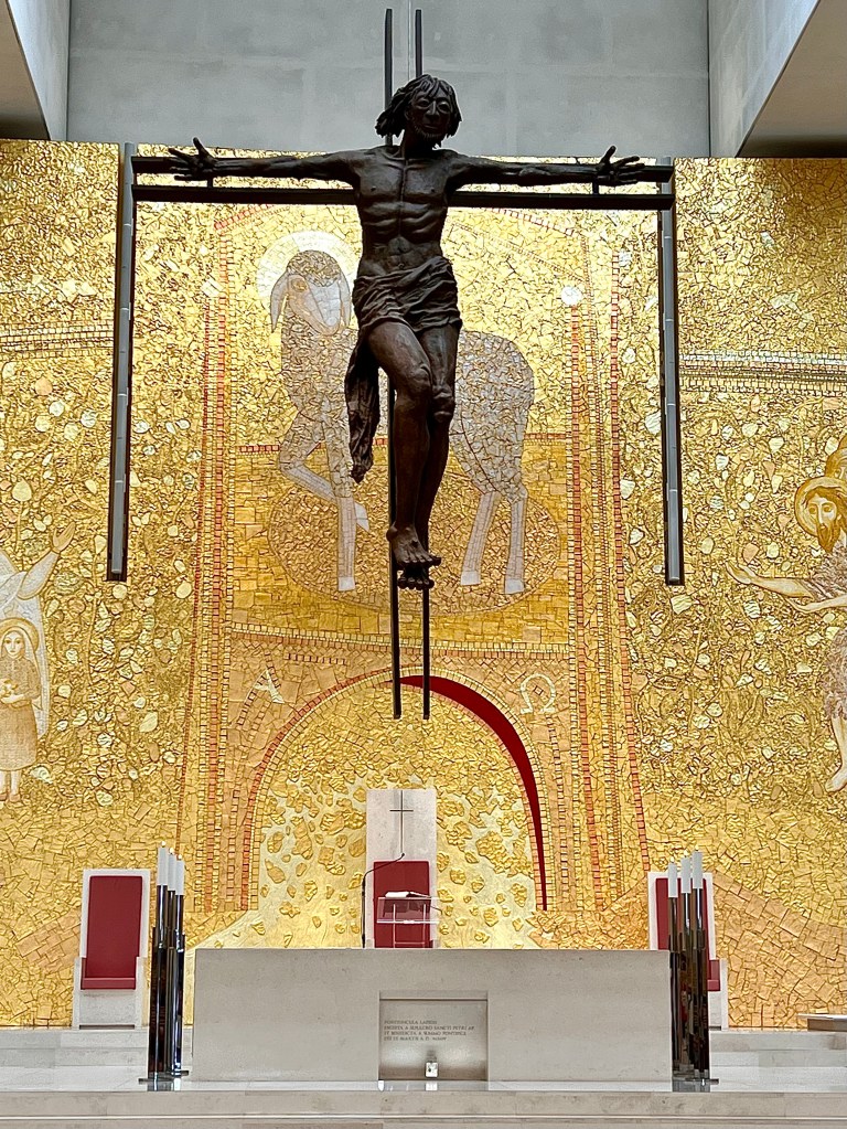 As you enter the grounds, the Basílica of the Holy Trinity, a modern round, white concrete building sits behind the Fatima Pope Square. This is a newer building to accommodate the throngs of pilgrims visiting. The gold tile wall holds the immense crucifix of a Jesus whose outstretched arms on the cross appear to be beckoning souls for an embrace. It is a provocative piece. The church can seat over three thousand people. Mass begins by welcoming people in many languages, indicative of the world wide draw to this place.