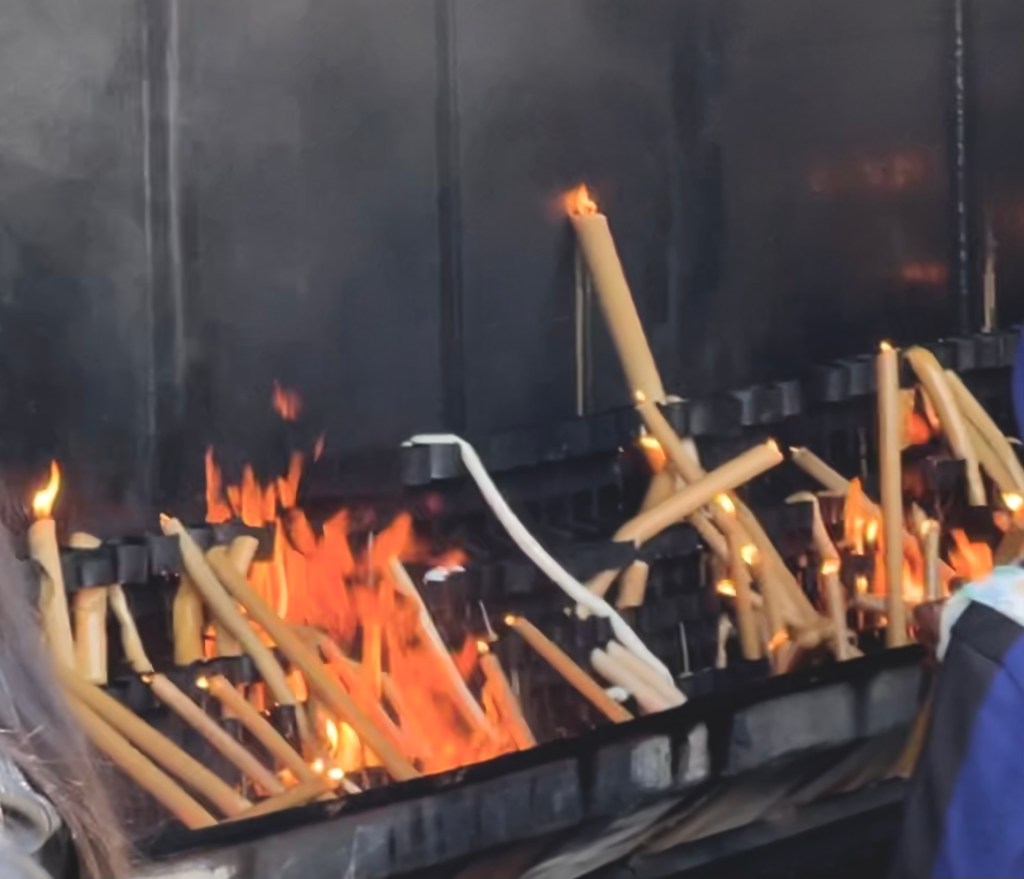 A line of people carrying candles of all sizes, some by the arm full, wound down and around for hours on end. On closer inspection not only were there traditional candles, but also wax shapes of body parts to be healed, babies to be prayed for, and other wax representations that were tossed into the flames.