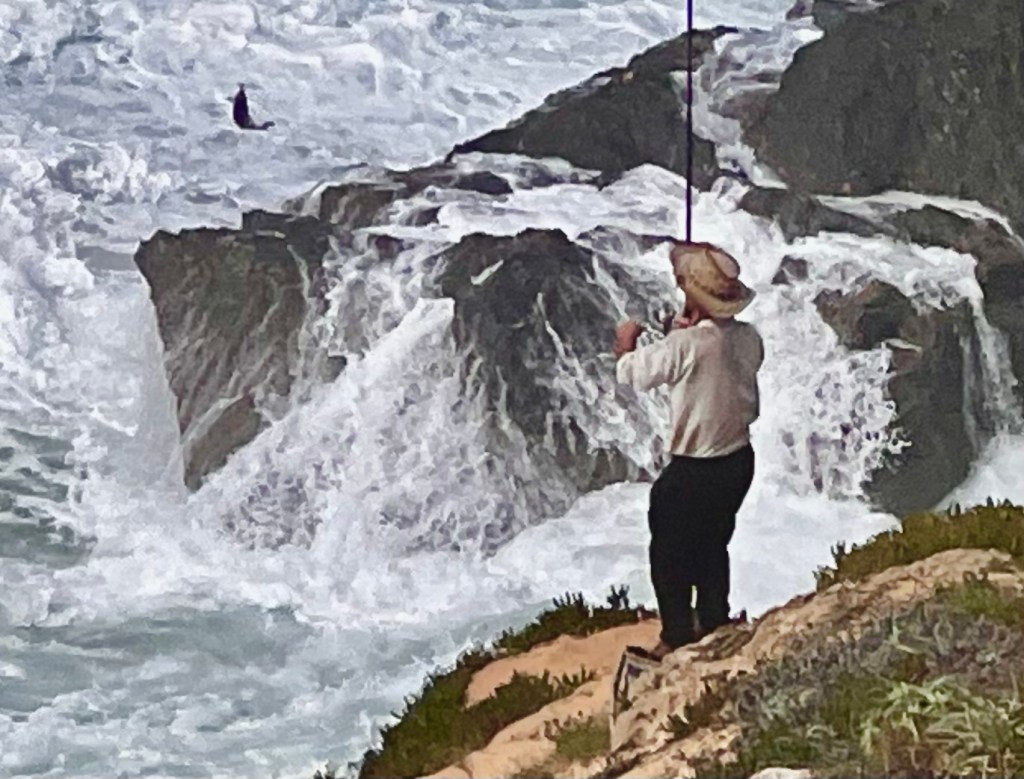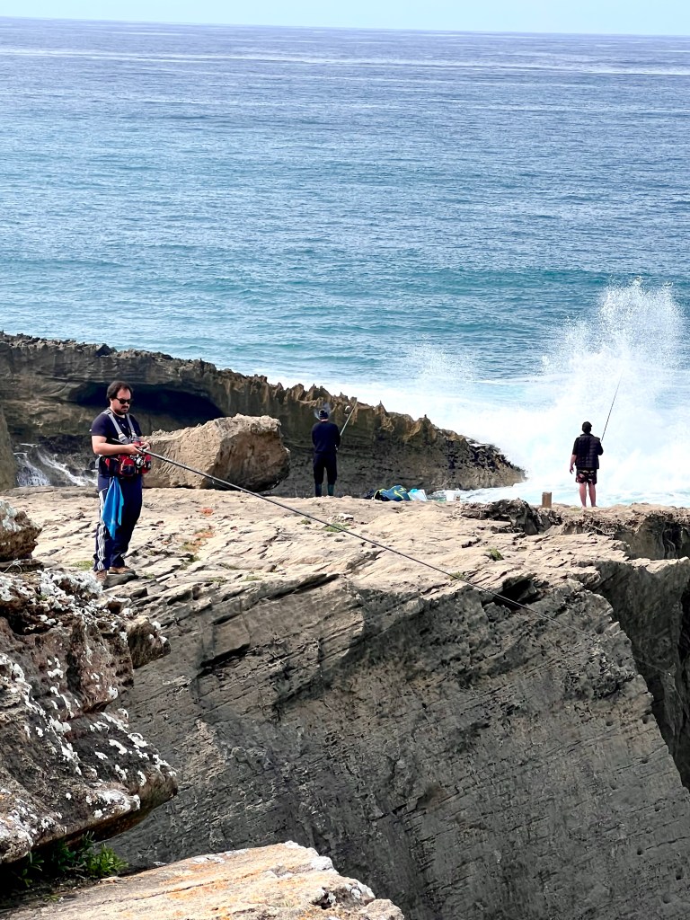 The tide is coming in and the high waves are even more dramatic than earlier. A fisherman on the cliff ahead of us is nearly lost from sight as the wave slams and splashes up over the top of the land.