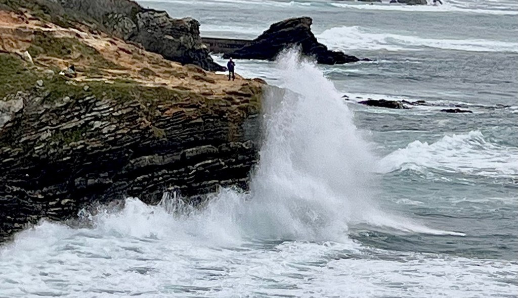The tide is coming in rapidly now. The trail winds around the cliffs which have been cut jagged by the pounding sea. There is a maritime event going on with a warning for dangerously high seas for the next two days. The sky is blue and the wind is not too bad, but the waves are incredible.