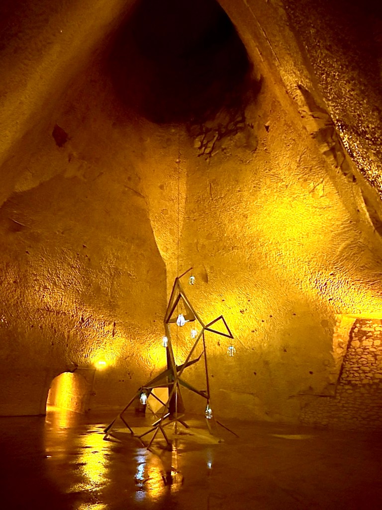 The caves hold racks of bottles at various stages of fermentation as well art. One of the highlights of the 2 hour tour is an impressive (and massive) art installation made of wood and lights. On cue the music fills one of the largest caves with a kaleidoscope of light and sound.