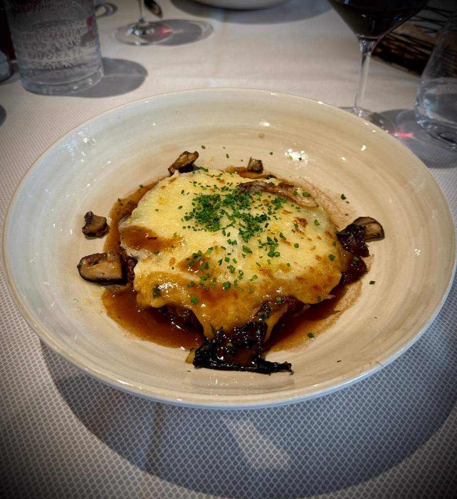 The food was exquisite. A cauliflower and mushroom soup and a patè with salad, followed by a beef cheek with mushrooms and mashed potatoes. The conviviality of the patrons around us and the care of the staff ( who spoke little English but were gracious and kind) made this a priceless experience.