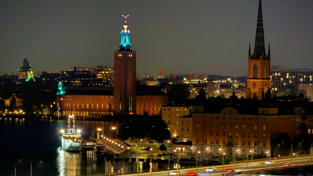Stockholm by night — City Hall glowing on the water, a beacon of the capital