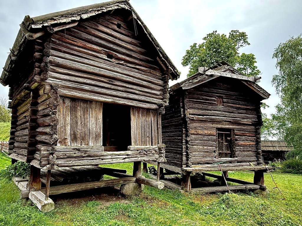 Log-built farm buildings, preserved at Skansen to showcase rural life from centuries past