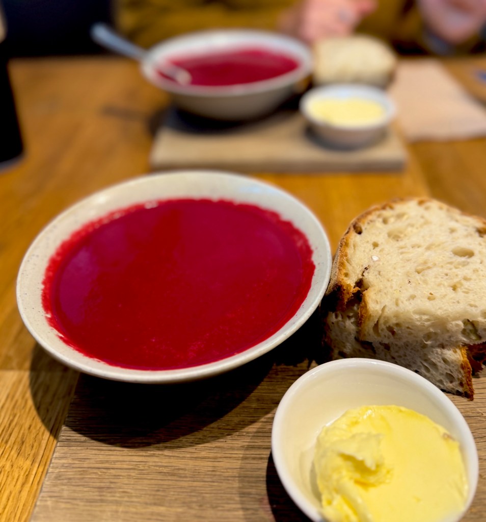 Beetroot soup, crusty bread, and butter—the perfect remedy after a rainy hike