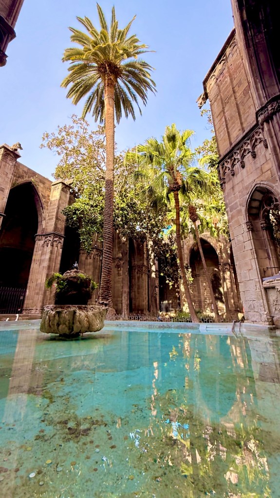A quiet oasis of palms and reflection in the cloister of Barcelona Cathedral — where the city slows to a whisper.